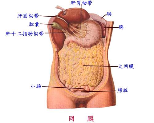 是连于胃大弯和横结肠之间的四层腹膜。呈“围裙”状悬挂于横结肠和小肠之前。大网膜内含脂肪、血管、淋巴管等,活动度大,有限制炎症蔓延的作用。