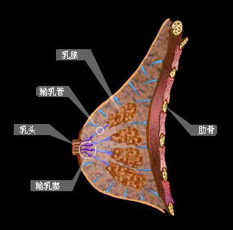 乳房腺体由15~20个腺叶组成,每一腺叶分成若干个腺小叶,每一腺小叶又由10~100 个腺泡组成。这些腺泡紧密地排列在小乳管 周围,腺泡的开口与小乳管相连。多个小乳管汇集成小叶间乳管,多个小叶间乳管再进一步汇集成一根整个腺叶的乳腺导管,又名输乳管。 输乳管共15~20根,以乳头为中心呈放射状排列,汇集于乳晕,开口于乳头,称为输乳孔。