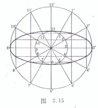 [压缩法] 用长短轴为直径画出两个同心圆,并将圆周12等分(小圆分点1~12,大圆分点对应为