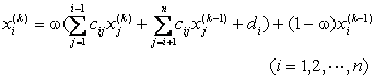其他步骤同简单迭代法.上式中w是常数,称为松弛因子.适当选取w可以提高收敛速度,通常w取为1.5~2(当取wÎ(1,2)时,称为超松弛迭代法,当取wÎ(0,1)时,称为低松弛迭代法).