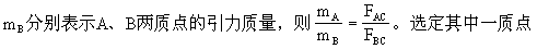 其中m1和m2代表两个物体各自产生引力场和受引力场作用的本领,也叫做两物体各自的“引力质量”。r代表两物体间的距离,F是作用于两个物体间的万有引力,G是一个常数,其大小由选择F、r、m1和m2的单位而定。由万有引力定律公式知,物体A和B的引力质量m′A和m′B之比,定义为它们各自与另一物体的万有引力FA和FB之比,即