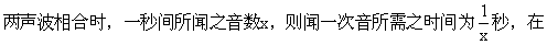 例如两个音叉的频率,一为251,一为250,当同时敲两音叉时所合成之声波,其拍频为1。