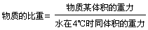 除气体外,任何物质某体积的重力,和4℃时同体积的水的重力相比,即称为该物质的比重。物质的重力和其质量成正比,则其单位体积的重力,必和其密度成正比,所以任何物质的比重,又等于该物质和水在4℃的密度相比。列式如下。