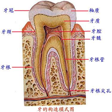 牙的构造包括牙质、牙釉质、粘合质。 Including dentin tooth structure, enamel, adhesive quality. 牙质为主体,牙釉质覆盖于牙冠表面,粘合质也称牙骨质,包在牙根、牙颈周围。 Dentin as the main body, enamel covering the crown surface, the adhesive substance, also known as cementum, wrapped in root teeth around the neck.
