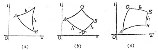 ,它处处不与特征方向相切.过A,B分别引最左和最右的特征曲线l1及l2.要求函数u(x,t),v(x,t)在