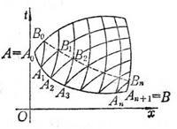 Take n sub-points A 1 , A 2 , A n on the curve AB , and denote A as A 0 , B as A n +1 , draw a straight line through A 0 according to the second characteristic direction of A 0 and through A 1 according to The first characteristic direction of A 1 is drawn as a straight line to intersect at B 0 ; the second characteristic direction of A 1 through A 1 is drawn as a straight line and the first characteristic direction of A 2 is drawn as a straight line through A 2 to intersect at B 1