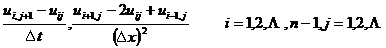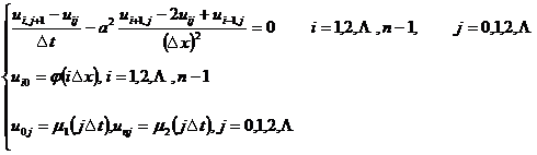 由此可按t增加的方向逐排求解.在第0排上ui0的值由初值(ix)确定,j+1排ui,j+1的值可由第j排的三点(i+1,j),(i,j),(i-1,j)上的值ui+1,j, uij,ui-1,j确定,而u0,j+1,un,j+1已由边界条件1((j+1)t)及2((j+1)t)给定,于是可逐排计算一切节点上的uij值.当(x), 1(x)和2(x)充分光滑,且